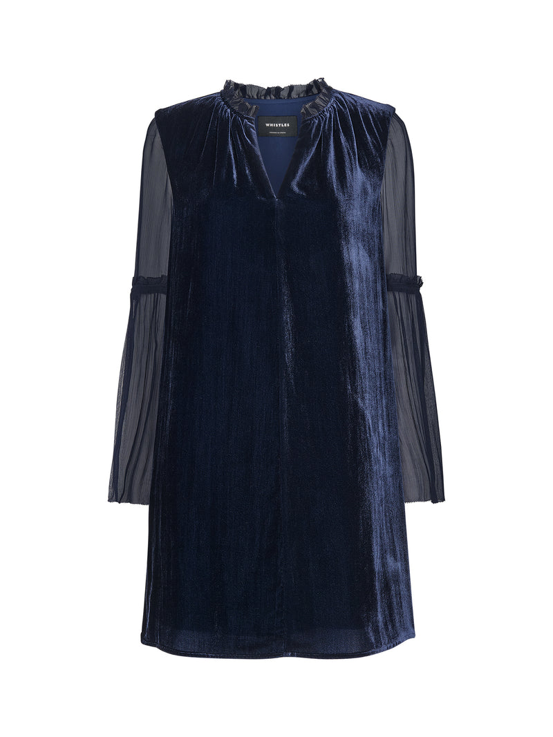 The Velvet Sheer Sleeve Dress by Whistles combines a smooth velvet body with sheer sleeves for tonal contrast. The composition feels modern and textural - an elevated evening option with subtle drama and refined simplicity.
