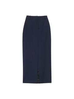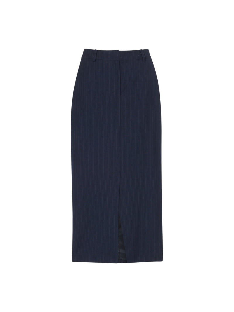 Chic and modern, our latest Pinstripe Tailored Midi Skirt is a versatile addition to your wardrobe. It comes in a classic navy shade with pinstripe pattern and features a front split for ease of movement. This skirt is a standout piece for any professional style.