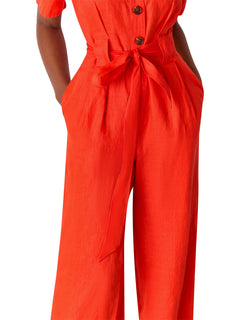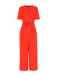 The Red Fiona Linen Button Jumpsuit features short sleeves and a regular fit for comfortable wear. Made from breathable linen, it includes buttons down the front and a matching belt to cinch the waist, combining style with practicality. This jumpsuit offers a relaxed yet polished look suitable for various occasions.
