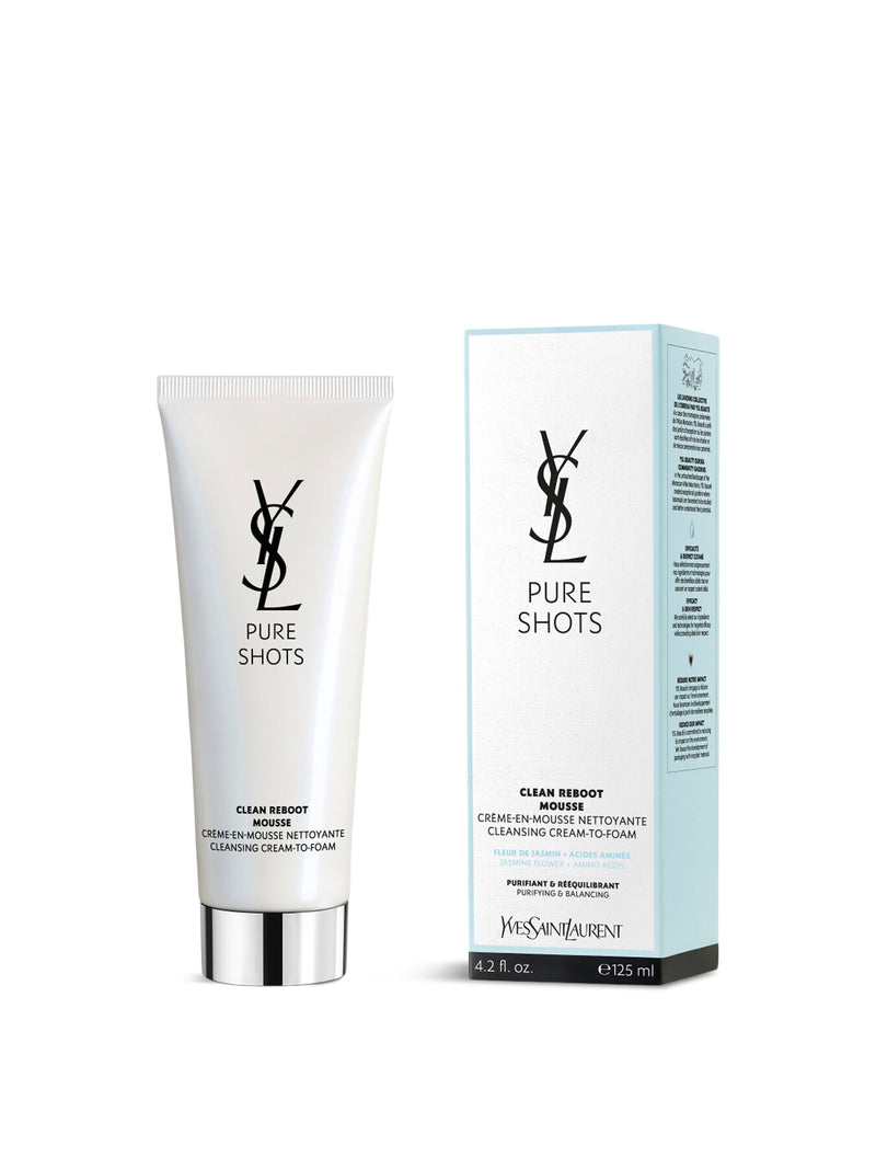 Experience the innovative formula of YSL's Pure Shots Clean Reboot Mousse, a gentle cream-to-foam cleanser that effectively removes impurities and excess sebum for balanced, purified skin. Infused with a potent blend of purifying actives and refreshing Jasmine Flower extract, this transformative cleanser effortlessly removes urban life impurities and makeup residues. Use as the first step in your Pure Shots skincare routine for a refined, glowing complexion.