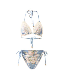 The Cascadian Crochet Bikini by Zimmermann is hand-crafted in botanical tea-blue tones. The intricate crochet detail and flattering triangle shape evoke nostalgic craftsmanship - a statement piece for resort escapes and sun-drenched days.