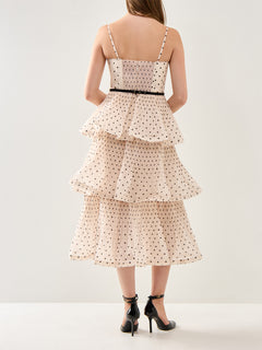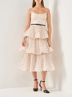 Pleated Tiered Midi Dress Cream Black Polka Dot