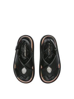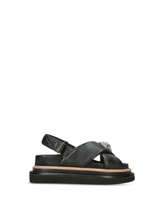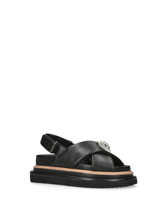 The Kurt Geiger London Orson Cross Strap Sandal is crafted from a smooth black leather. There is a silver eagle head with crystals and crystal eyes on the front. The ankle strap is fastened with velcro. Platform sole height: 7cm.