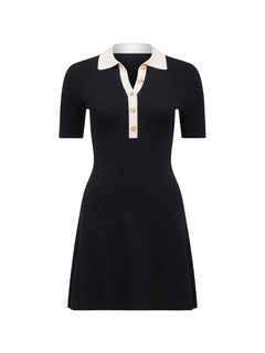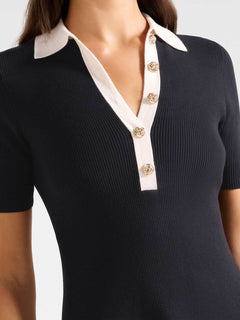 The Phoebe Short Sleeves Trim Mini Dress features an A-line silhouette crafted from a ribbed knit viscose mix for a comfortable and flattering fit. It includes a classic collar with button fastening, short sleeves, and contrast detailing on the collar and button placket. Gold-tone buttons add a touch of elegance, while the slip-on style ensures easy wear, making this dress both stylish and practical.