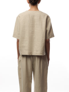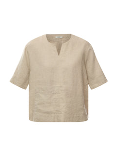 Linen is timeless, temperature-regulating, and beautiful - perfect for a chic layered look. This simple, solid-coloured linen top is tailored with a classic cut and straight lines, providing ample comfort. It features half-length sleeves, a decorative pocket at the front, and a small slit in the neckline. Pair the top with loose trousers, a feminine shirt, and finish the look with a short jacket.