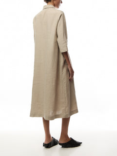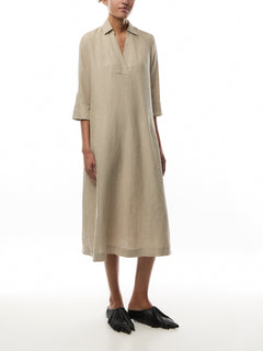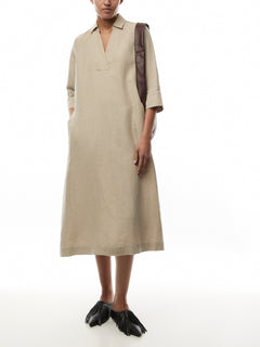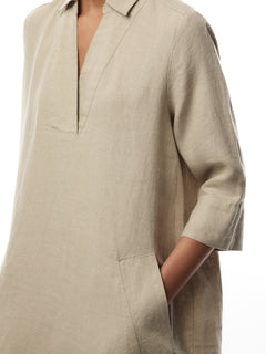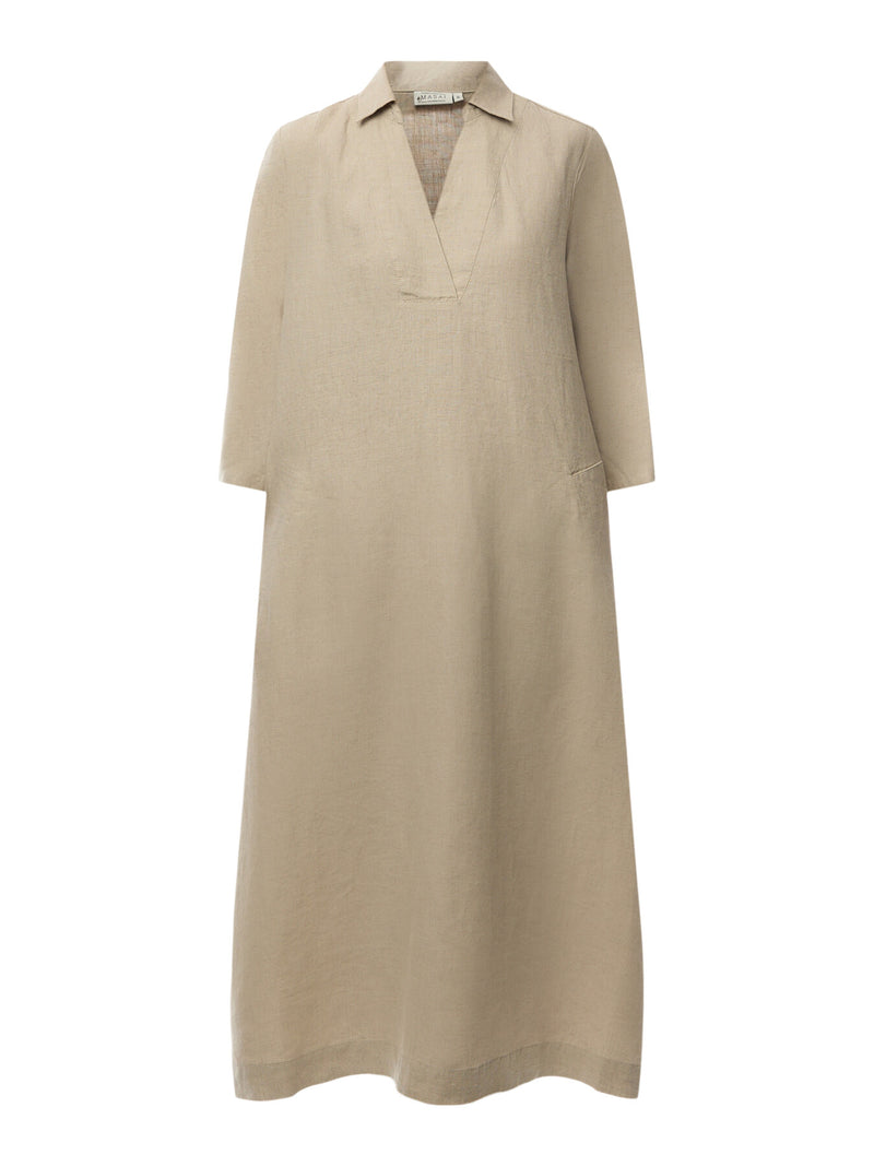 You'll love wearing this solid-coloured linen dress again and again. It boasts a simple look with a shirt collar and deep V-neck, while the classic cut with straight lines ensures it drapes softly and comfortably over the body. Notice the discreet slit pockets at the sides, perfect for slipping your hands into. Wear the dress on its own or add a fresh splash of colour with a scarf.