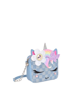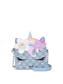 Gwen Daisy Butterfly Rainbow Crown Checkerboard Denim Crossbody Bag