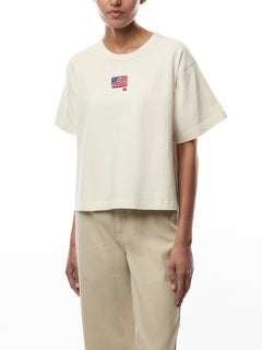 Embodying signature Polo style, this cotton jersey tee features a crocheted appliqué version of a historical American flag with whipstitching and Ralph Laurens embroidered monogram logo at the front.