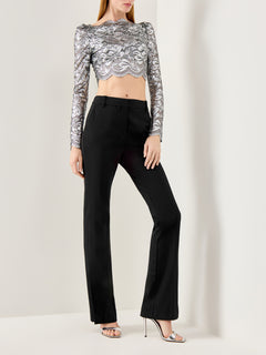 Rabanne’s Haut Stretch Lace Top in Black and Silver blends sheer detailing with contemporary edge. Designed for statement evening dressing, it highlights the brand’s bold, modern femininity.