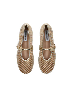 The Rejoice-R 045 Ballerinas feature a mesh fabric upper that offers breathability and a delicate look. They are secured with a metallic strap fastening, adding a stylish and modern touch. These ballerinas combine comfort with elegant detailing, suitable for various occasions.