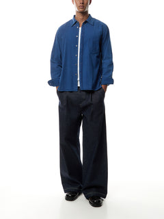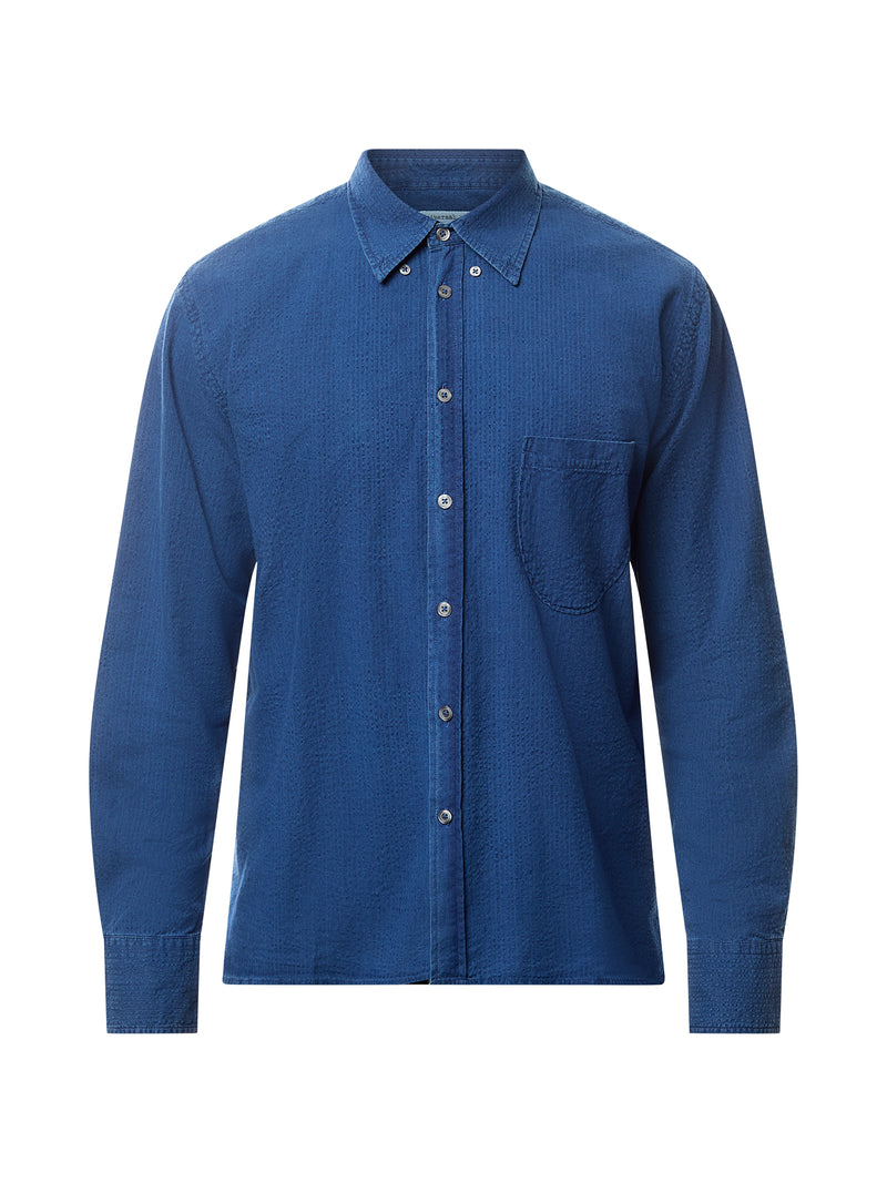 The Lazy Day Shirt by Universal Works has a relaxed fit for a casual appearance. Made from lightweight cotton with a textured seersucker finish, it includes a full button-through front, a classic button-down collar, buttoned cuffs, a curved hem, and a single chest pocket.