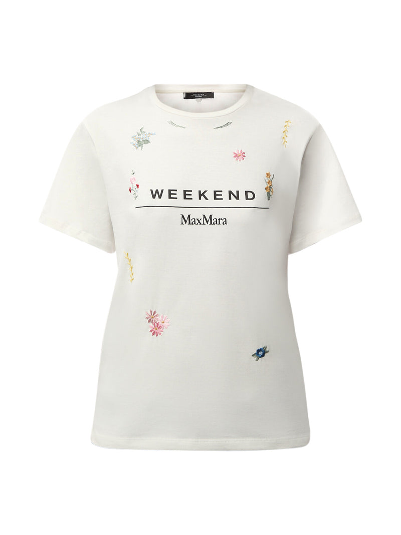 Short-sleeved T-shirt in soft pure cotton jersey fabric. The straight-fit crew-neck model is customised with an embroidered print and brand logo on the front.