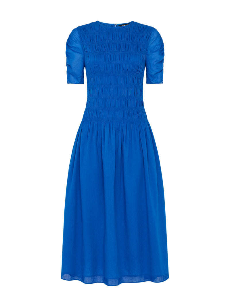 The Blue Avery Smocked Dress features elegant ruched detailing that adds texture and style. Designed with a regular fit, it offers comfortable wear throughout the day. Its short sleeves make it perfect for warmer weather or layering with a jacket. This dress combines classic design with subtle accents for versatile wardrobe appeal.